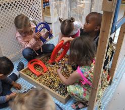 Je kent het spelletje ‘Hamertje Tik’ wel nog van vroeger! Met een hamertje tik je ronde vormpjes door de gaatjes of sla je spijkers in kurk. Je hebt fysieke kracht nodig en ontdekt hoe iets in elkaar past. Een eerste ‘werkervaring’ dus. Onze versie van Hamertje Tik wordt een pleintje waar jonge kinderen verschillende huisjes ontdekken. Via spannende straatjes beweeg je je van een gek huisje naar een klein schuurtje. En daar kan vanalles gebeuren. Je bouwt zelf een muurtje. Of tikt met 10 vingers een brief op een ouderwetse typemachine, stopt ‘m in een envelop en doet hem op de post. Aan de zandlopers zie je hoe de tijd verstrijkt. Welke bonen kun je allemaal fijnmalen? Is er een